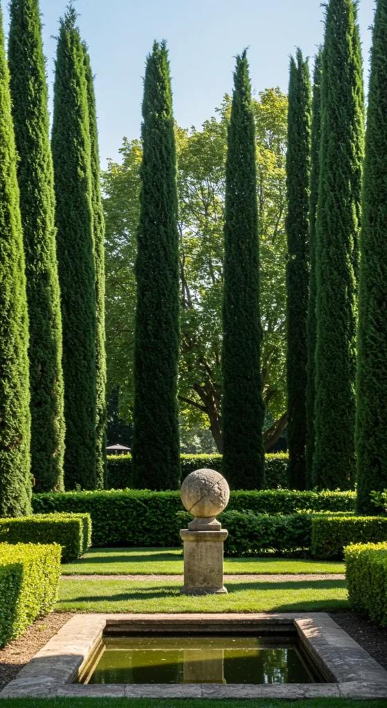 Formal Garden with Tall Cypress Trees and Elegant Water Feature