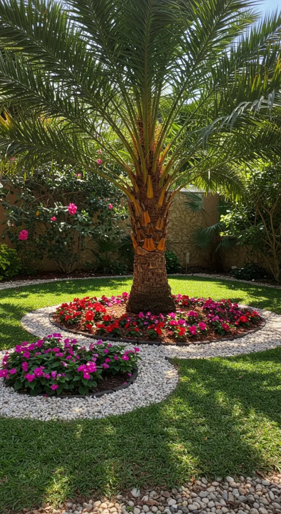 This vibrant garden centers around a tall, elegant palm tree, with lush fronds reaching toward the sky. Around the base, circular flower beds are filled with bright, colorful blooms in shades of pink and red, creating a stunning contrast against the green lawn and white gravel that outlines the flower beds. The design is neat and symmetrical, with the palm standing as the focal point, while the flowers and stones add texture and depth to the landscape. The sunny setting makes the colors of the flowers pop, further enhancing the cheerful atmosphere of the garden.