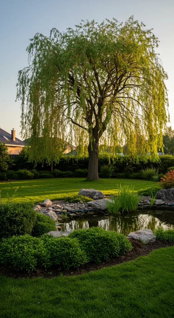 This tranquil garden design is centered around a stunning weeping willow tree, whose long, graceful branches drape down to the ground, creating a soft, flowing canopy of greenery. Beneath the tree, a peaceful pond surrounded by smooth stones adds a serene water feature to the landscape. The lush greenery of the surrounding bushes contrasts beautifully with the calm, reflective surface of the water, enhancing the tranquil atmosphere of the space. The carefully manicured lawn complements the natural flow of the tree, offering a perfect spot to relax and unwind.