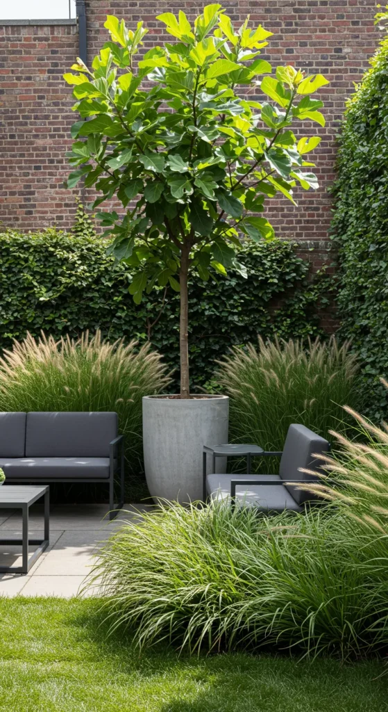 This sleek patio design combines clean lines with lush greenery, featuring a striking fiddle leaf fig tree planted in a large concrete pot as the focal point. The tree’s large, glossy leaves provide a beautiful contrast to the modern outdoor furniture, including a simple, yet stylish, seating arrangement. Soft ornamental grasses frame the space, adding texture and a natural, calming element. The backdrop of ivy-covered walls and the well-manicured lawn enhance the peaceful atmosphere, making it an ideal spot for relaxation.