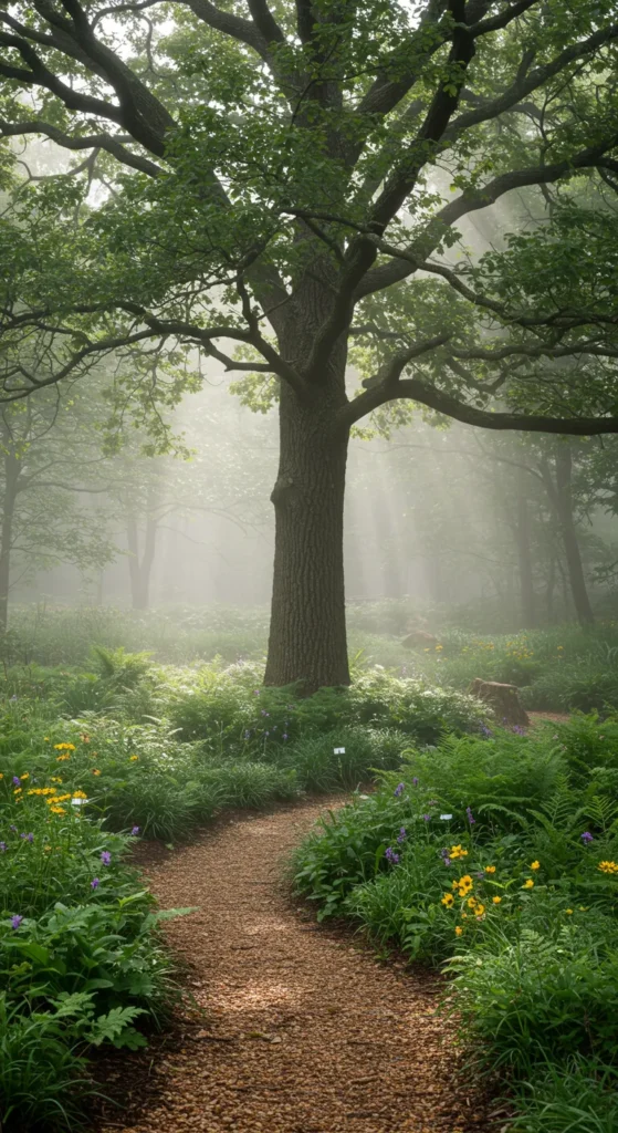 What I love most about this design is how the oak tree seems to stand as a protector over the garden, its branches stretching high to frame the view. The soft light peeking through the leaves gives the whole scene a dream-like quality. I can’t get enough of how nature’s beauty has been allowed to take center stage here, with minimal intervention—just the perfect balance of greenery, flowers, and light. If you want a garden that feels like an enchanted forest, this path is all the inspiration you’ll need!