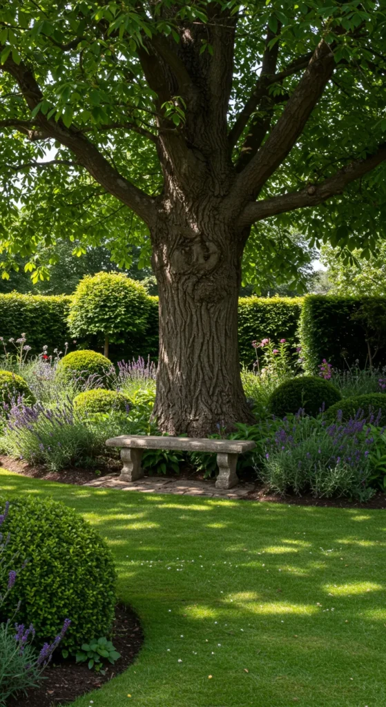 This tranquil garden nook is centered around a grand tree with a thick, textured trunk and a full canopy of leaves. Nestled under the shade, a simple stone bench invites relaxation. The surrounding garden is lush with perfectly manicured bushes and lavender plants, adding pops of purple against the deep green backdrop. The neatly trimmed hedges and soft grass underfoot create a peaceful, inviting space, perfect for quiet moments or casual outdoor gatherings.