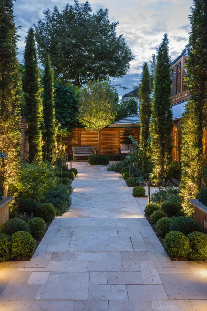 This patio design feels like stepping into a serene garden sanctuary. The stone pathway leads gracefully through tall, narrow evergreens, with soft lighting casting a golden glow on every leaf. The landscaping blends lush hedges, round boxwoods, and a central seating nook framed by warm wood fencing, giving the space structure while keeping it intimate.