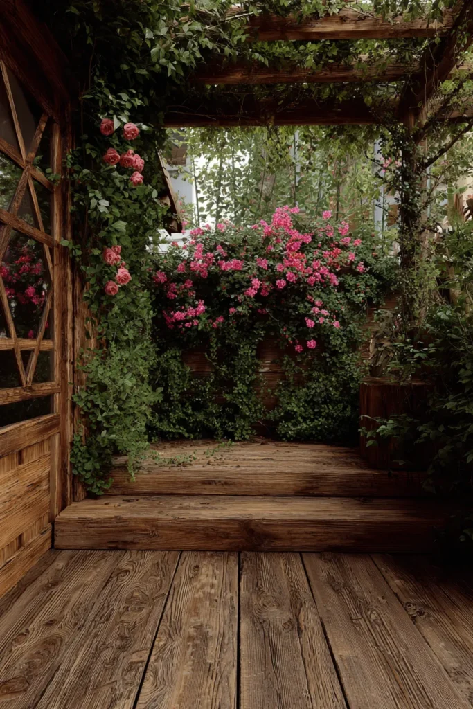 This patio feels effortlessly romantic with its rustic wooden deck surrounded by climbing greenery and pink roses in full bloom. The warm wood tones and natural vines make the space feel peaceful and full of charm.