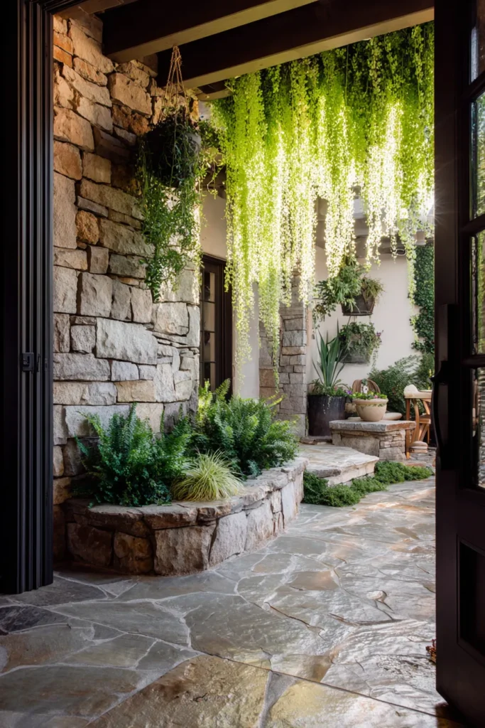 This patio blends natural stone textures with lush, cascading plants that hang dramatically from above. The soft green vines catch the sunlight perfectly, adding a glowing touch against the rustic stone walls. Layered planters filled with ferns and ornamental grasses make the whole space feel like a hidden jungle retreat.