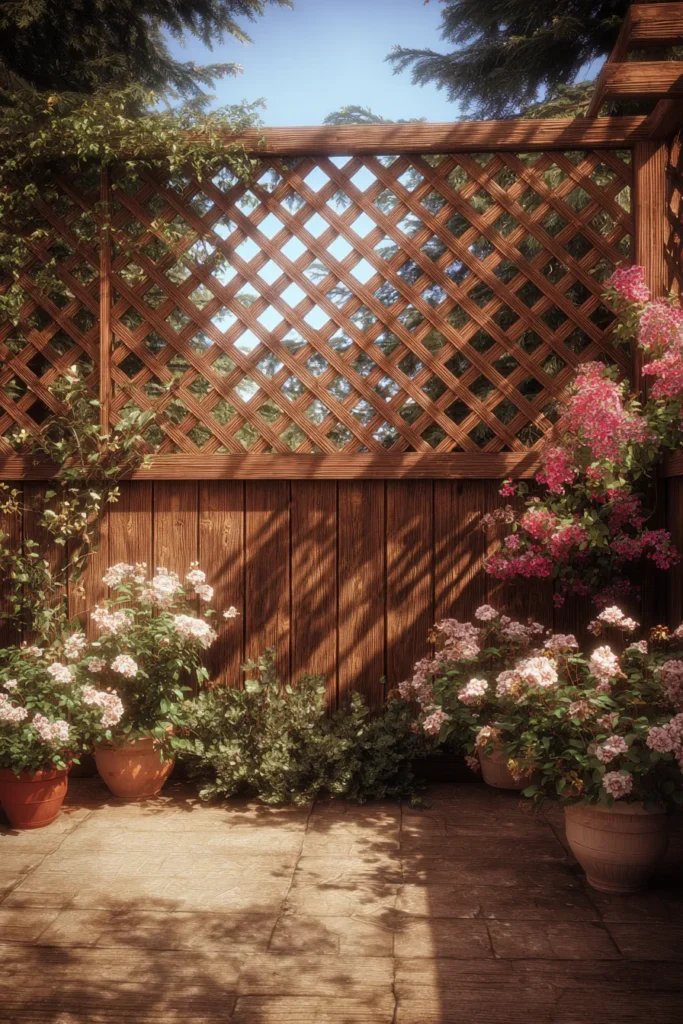 This charming corner feels intimate and inviting, framed by a warm wooden trellis and delicate flowering plants. The lattice design adds texture and privacy while allowing sunlight to create playful shadows across the space. Terracotta pots filled with soft pink blooms give it that simple, timeless charm.