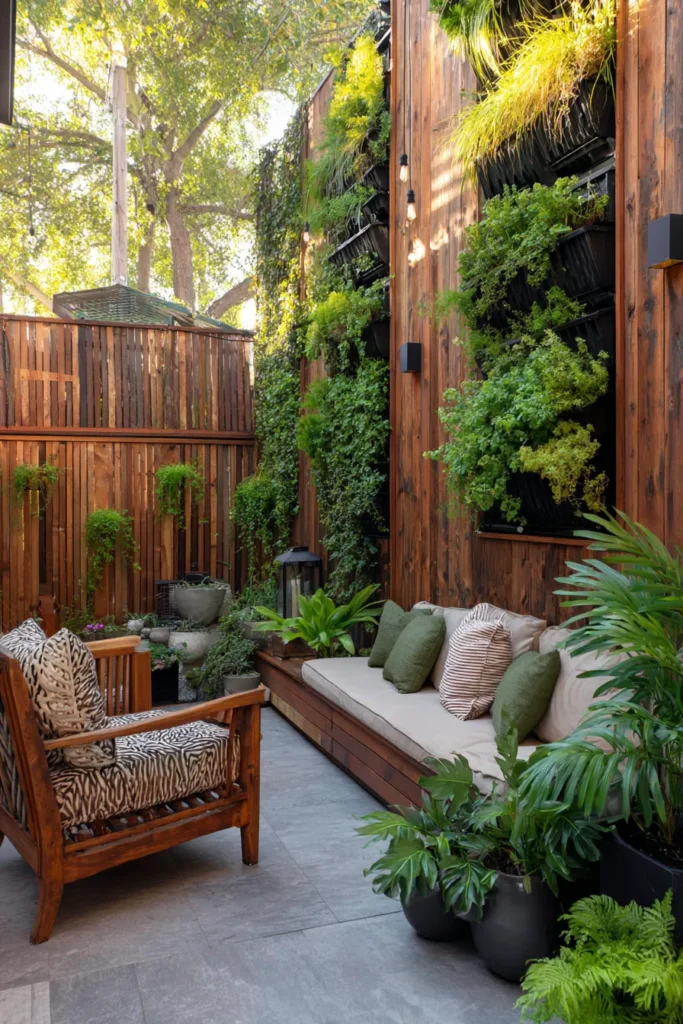 This narrow patio turns every inch of space into a green masterpiece. Wooden walls are covered with vertical planters filled with vibrant foliage, while sleek outdoor furniture keeps the look balanced and modern. Soft lighting adds a cozy glow that highlights all the different shades of green.