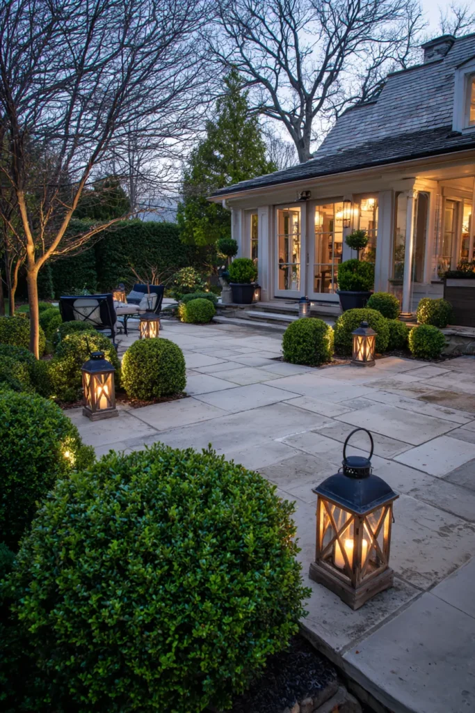 This elegant patio comes alive at twilight with glowing lanterns scattered among perfectly shaped boxwoods. The soft lighting bounces off the stone tiles and glass windows, creating a warm, inviting ambiance. Structured greenery gives the space a polished and timeless appeal.