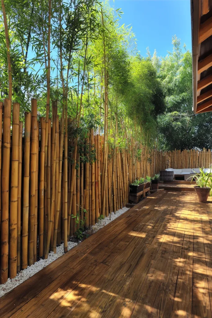 This design brings peaceful, natural vibes with tall bamboo plants lining a warm wooden deck. The vertical lines of the bamboo fence give the space rhythm and privacy, while simple planters and natural textures keep the look grounded and minimal.