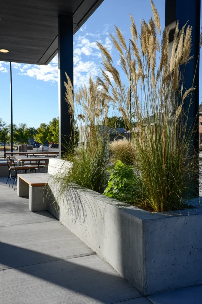 Tall ornamental grasses sway gently in sleek concrete planters, adding soft texture to this clean-lined modern patio. The simple furniture and open layout let the plants shine as the main feature, while the natural light creates depth and contrast.