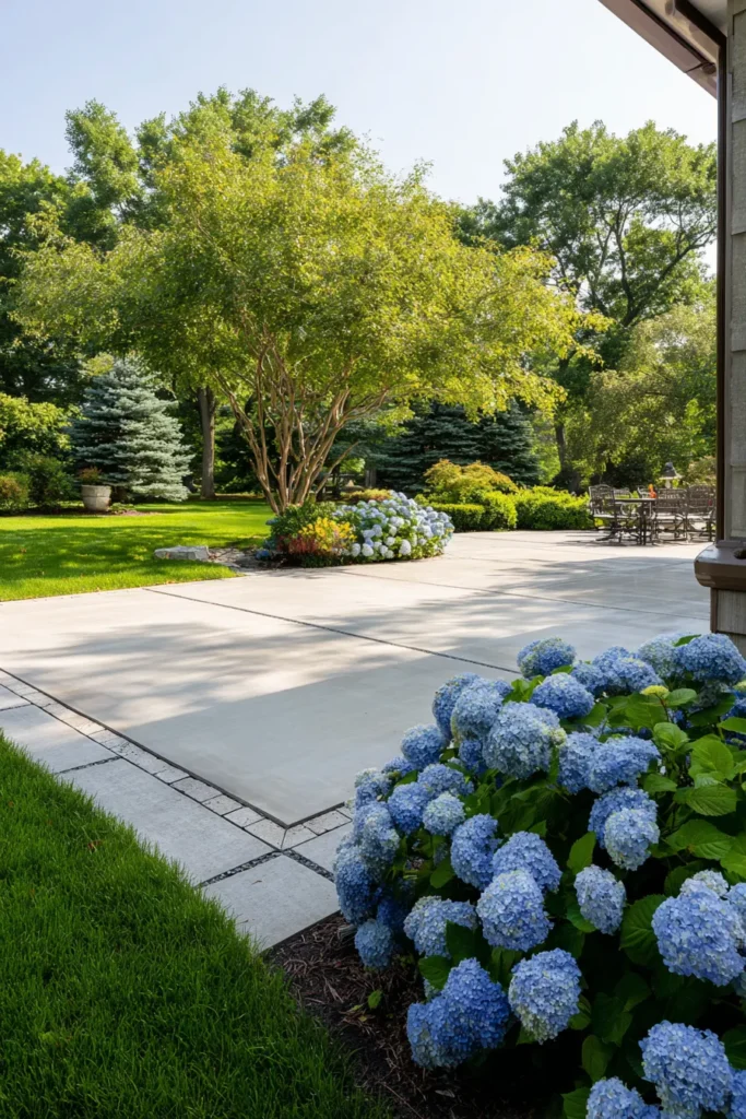This open patio glows with color thanks to the lush hydrangeas framing the edges. The concrete paving and neat lines balance out the abundance of blooms, while surrounding trees and shrubs make it feel like a natural extension of the garden.