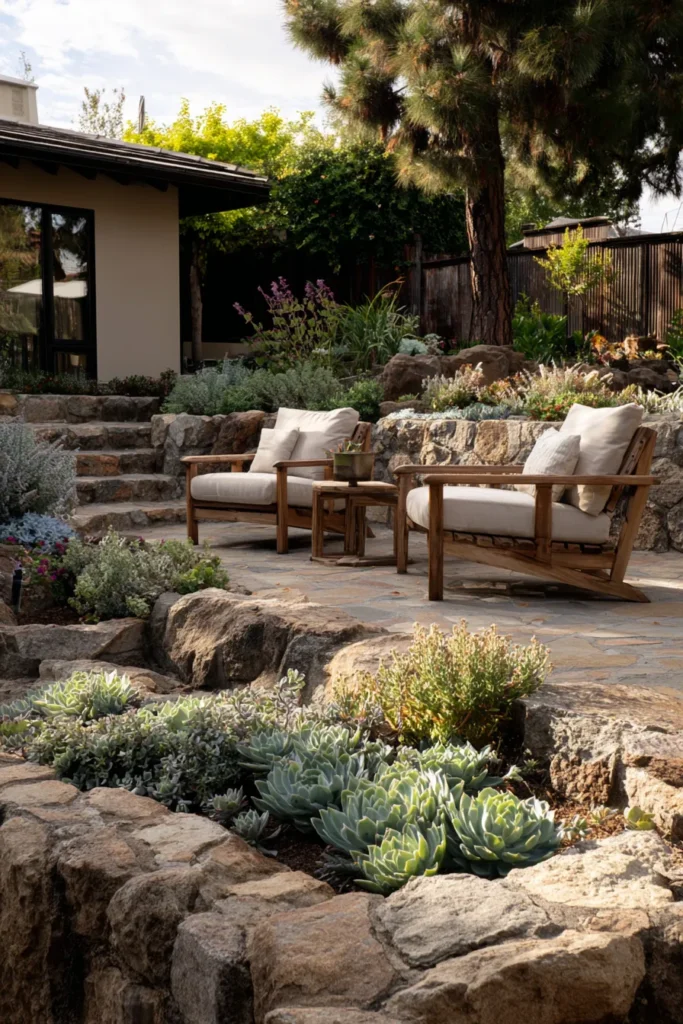 This layered patio feels like a seamless part of nature. Stone terraces filled with succulents and hardy plants climb gently upward, framing the cozy seating area with natural texture and depth. The neutral tones of the rocks tie everything together beautifully.