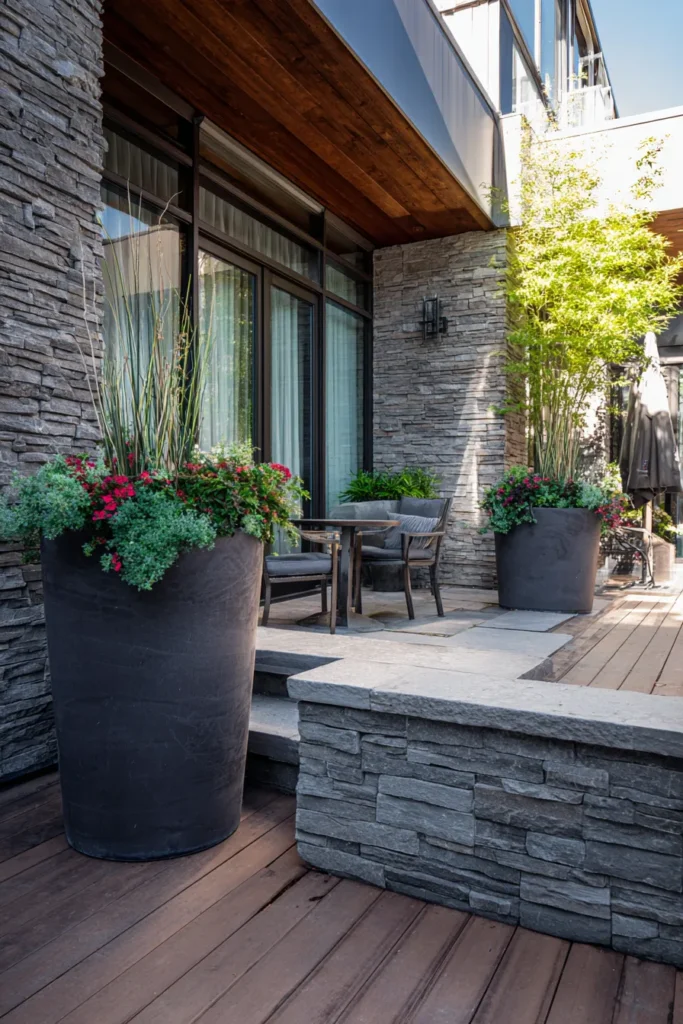 This design strikes a perfect balance between modern architecture and lush greenery. Tall stone planters filled with colorful flowers frame the entrance to a sleek outdoor seating area. The mix of materials—wood, stone, and metal—creates a polished yet inviting atmosphere.