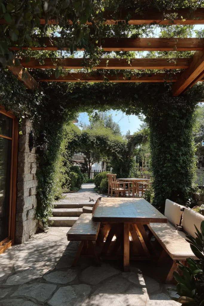 Here, nature takes the spotlight with a wooden pergola draped in thick, leafy vines. The stone flooring and solid wooden dining table add a charmingly rustic touch, while dappled sunlight filters through the overhead beams to create soft, shifting shadows. Everything feels organic, timeless, and inviting.