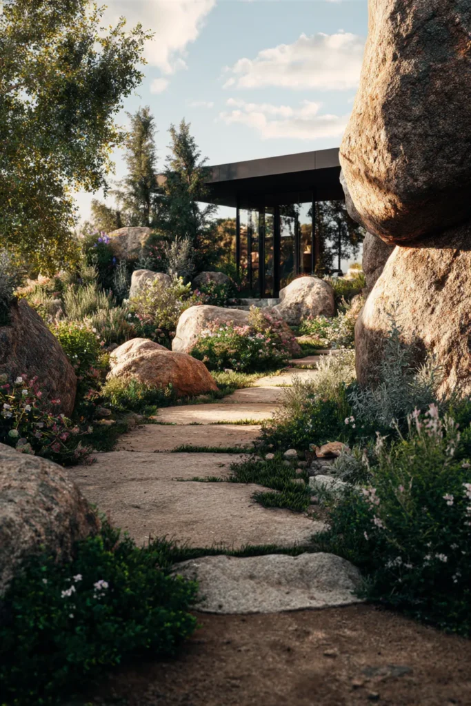 A natural stone path winds through large boulders and wild greenery, leading to a modern glass home nestled in the landscape. The mix of rough rock textures and delicate flowers creates an enchanting balance of strength and softness.