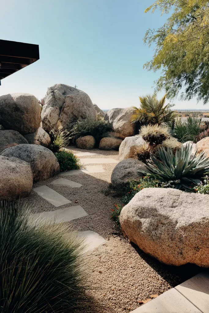 This landscape transforms rugged desert beauty into an artful retreat. Massive stones and succulents are arranged among sandy gravel paths, creating natural flow and contrast. The muted tones of the rocks blend seamlessly with desert plants, giving it a relaxed and sun-soaked aesthetic.