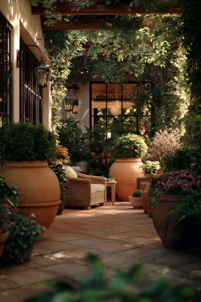 This patio bursts with Mediterranean warmth. Oversized terracotta pots line the tiled walkway, overflowing with lush greenery and flowering plants. The rustic wicker chairs and the soft light filtering through climbing vines create a space that’s both refined and homely.