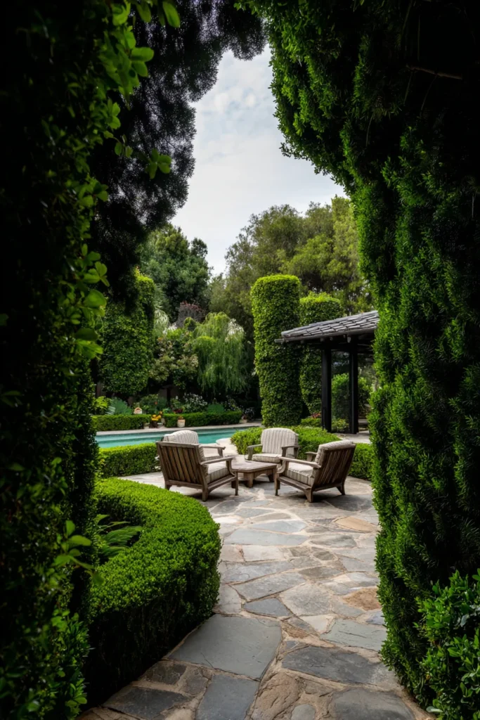 The tall, sculpted hedges and arching greenery frame a cozy stone patio like a living picture frame. Wooden chairs surround a circular table, all set near a pool that glimmers through the foliage. It’s private, lush, and effortlessly elegant.