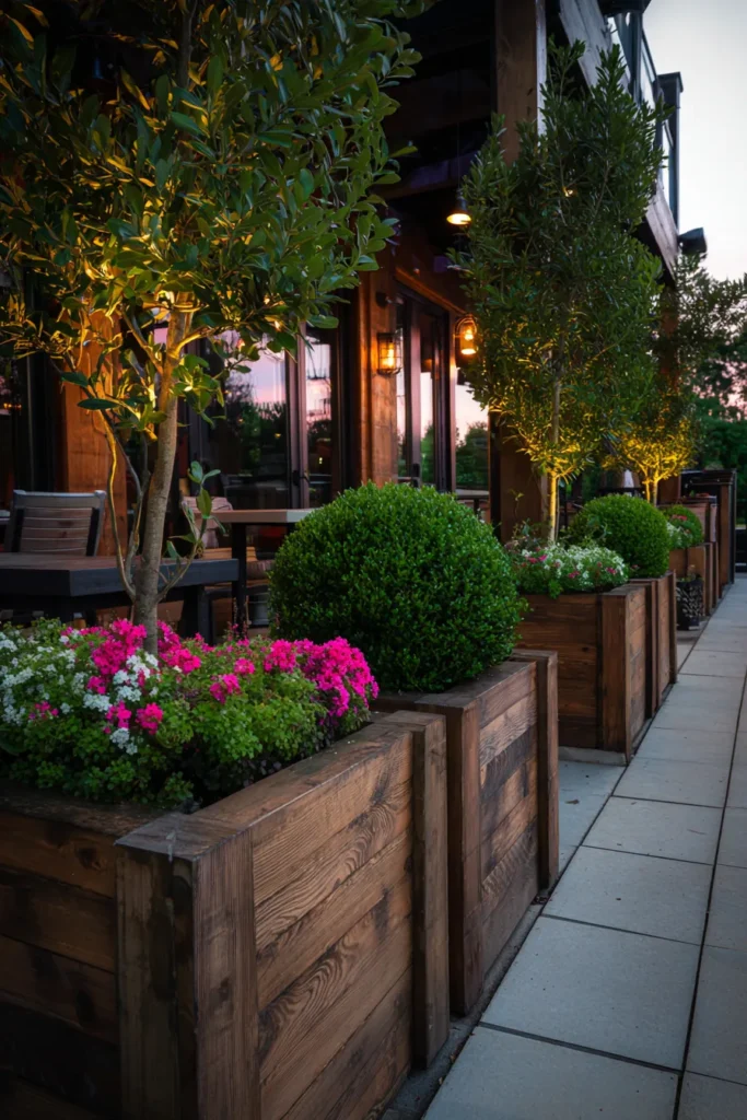 This space blends modern structure with natural beauty through neat wooden planters filled with vibrant flowers and trimmed greenery. Soft lights illuminate the foliage, creating a warm and romantic glow as the sun sets.