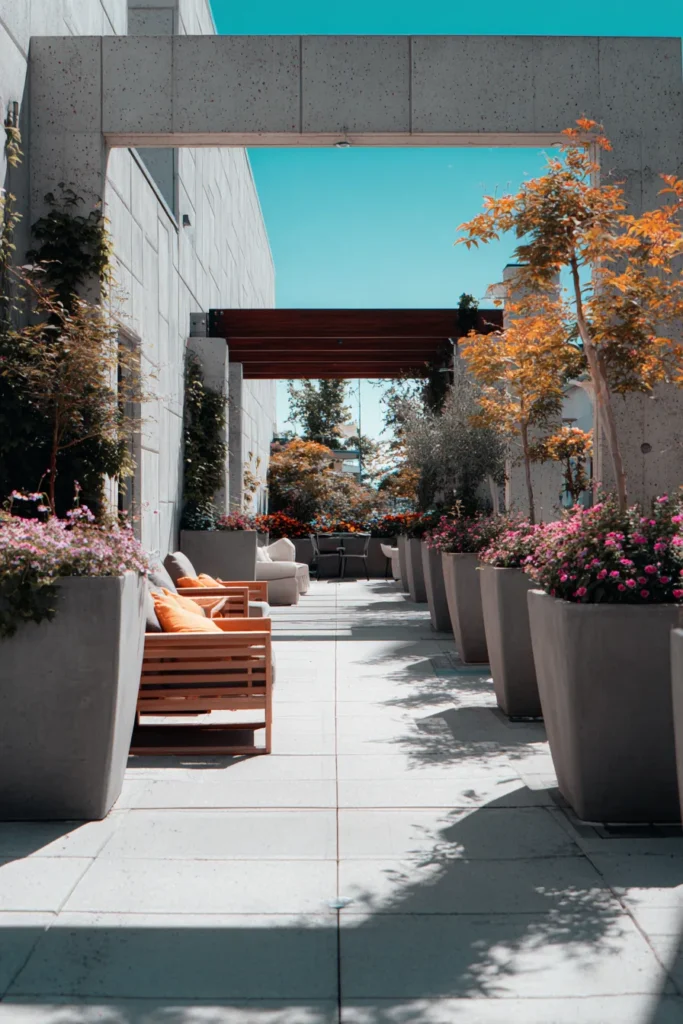 Clean lines and oversized concrete planters make this patio feel fresh and modern. The neutral tones are balanced with colorful blooms and wooden furniture that soften the structure. It’s a minimalist setup that still feels full of life.