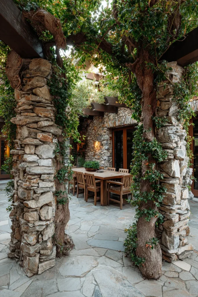 This design embraces old-world beauty with its weathered stone columns wrapped in vines. The flagstone floor and wooden furniture blend naturally with the earthy surroundings, creating a cozy, timeless courtyard vibe.