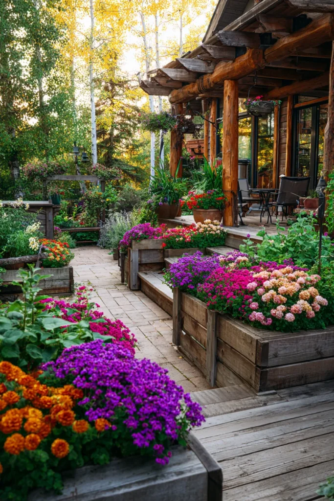 Bursting with life and color, this rustic patio uses raised wooden planters overflowing with bright blooms to frame the space. The log beams, wooden deck, and garden path make it feel warm and welcoming from every angle.