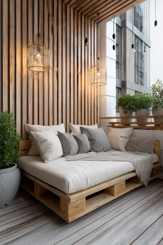 This tight deck uses a low profile bench with plush cushions to keep the space open. Vertical wood paneling draws the eye upward and makes the deck feel taller. Potted plants add softness without cluttering the floor.