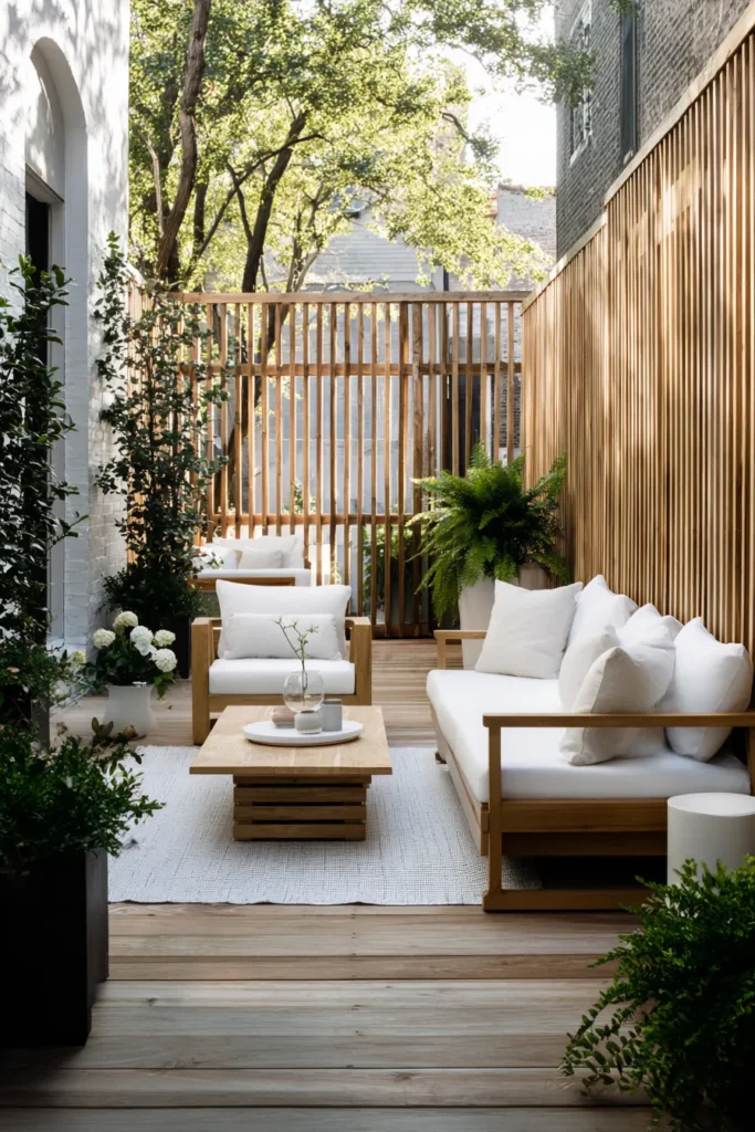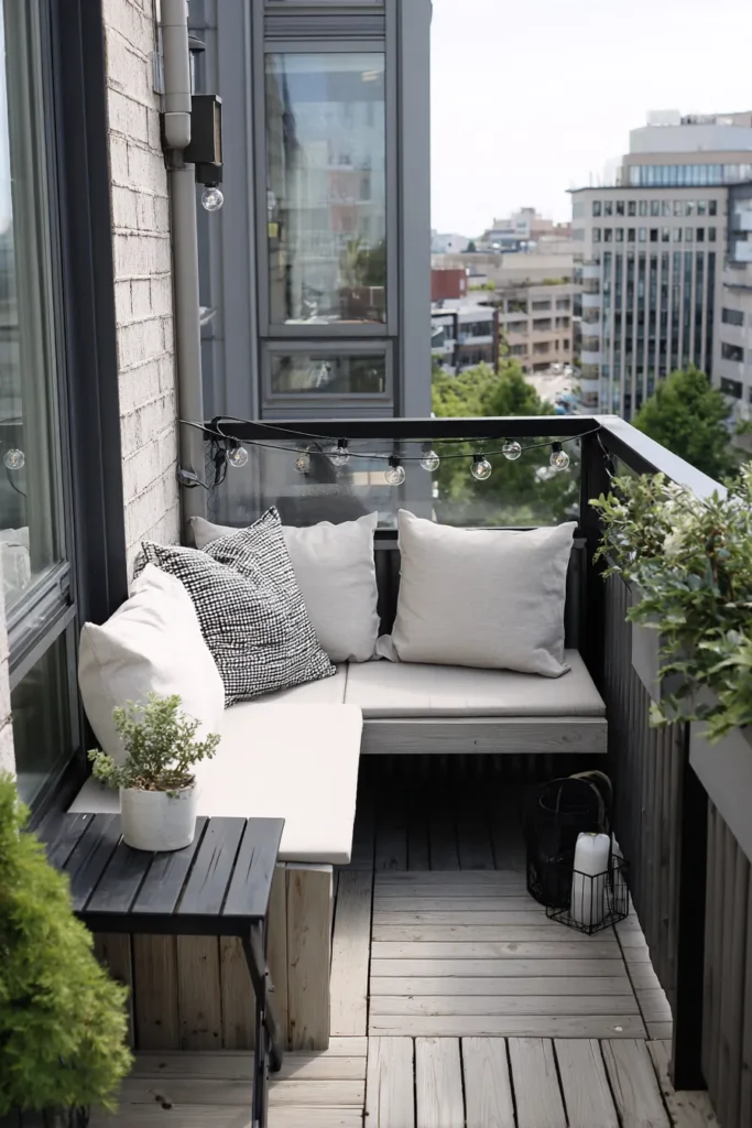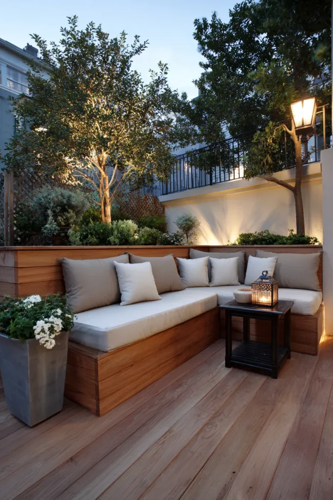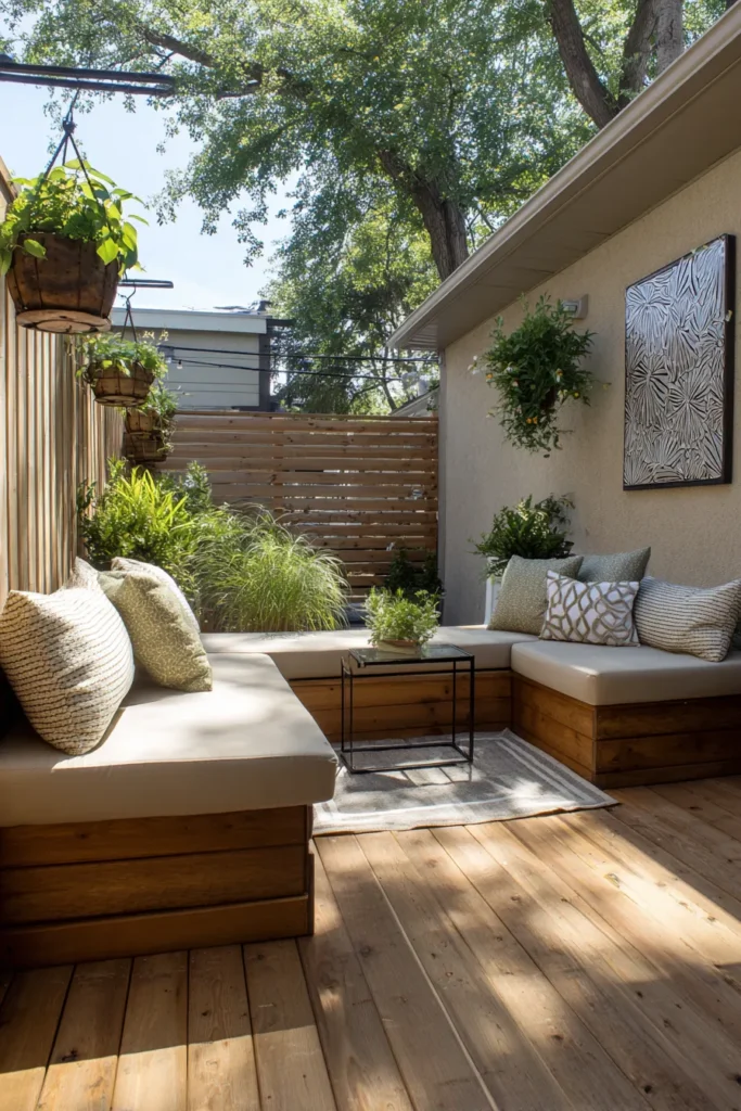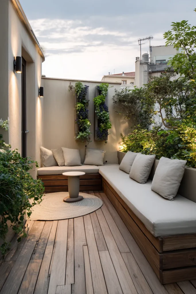 This small deck features built in corner seating that hugs the walls and makes the most of every inch. Neutral cushions keep the look calm and cohesive, while layered greenery and vertical planters soften the space and add privacy. A simple round table and subtle wall lighting keep the area functional without overwhelming it.