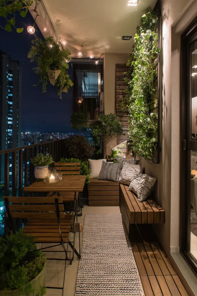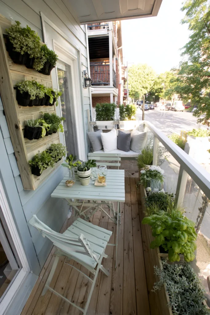 This small balcony uses vertical space beautifully with wall mounted planters filled with lush greenery that free up precious floor area. A compact bistro table and foldable chairs fit neatly into the narrow layout, while soft cushions on a built in bench add comfort without bulk. Light wood flooring and pale furniture keep everything feeling airy and open despite the tight footprint.