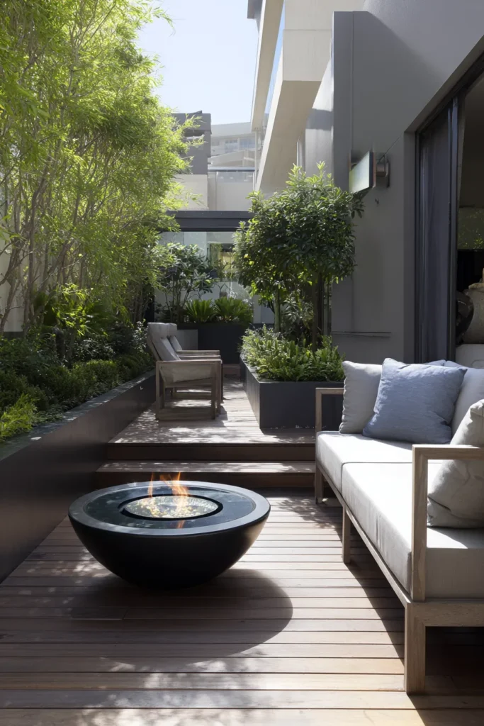 This compact deck centers around a low fire bowl paired with simple seating. The furniture stays minimal so the space doesn’t feel crowded, while plants and wood finishes add warmth. The layout feels balanced and calm.