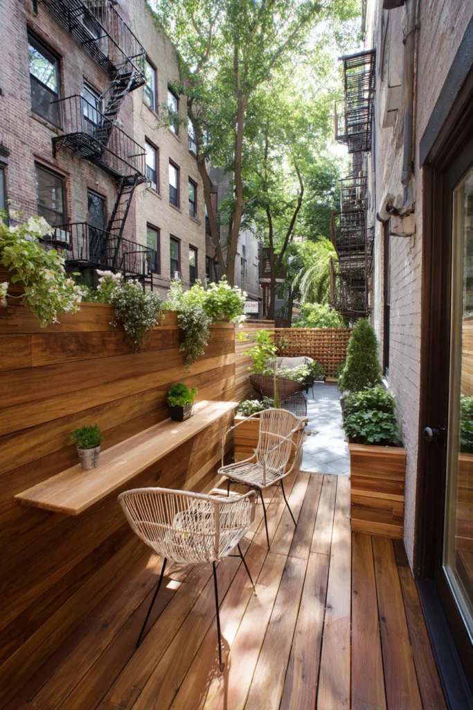 This small deck uses its narrow layout beautifully with a compact bistro table, slim chairs, and warm lantern lighting tucked neatly along the wall. The wood decking keeps things visually warm while potted plants soften the edges and make the space feel more inviting. Everything is scaled just right so it feels cozy instead of cramped.