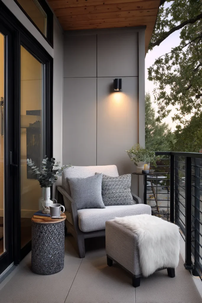 This small balcony focuses on one comfortable lounge chair paired with a compact side table. Neutral cushions keep the look light, while vertical elements like railings and plants help the space feel taller.