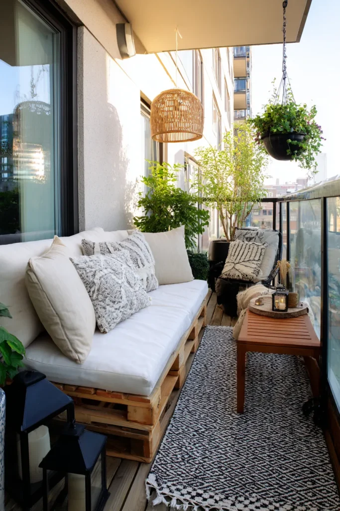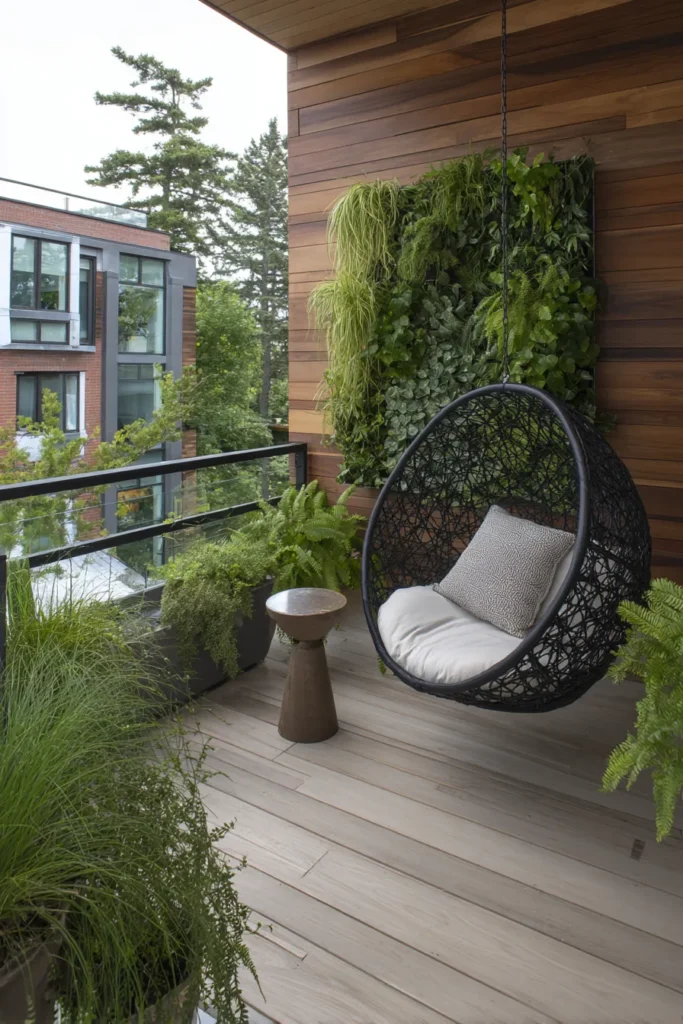This tight outdoor space features a hanging chair tucked neatly into a corner, freeing up floor space while adding visual interest. Soft textures and greenery surround the chair, making the area feel cozy and personal.