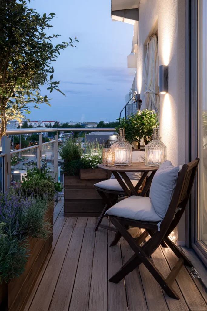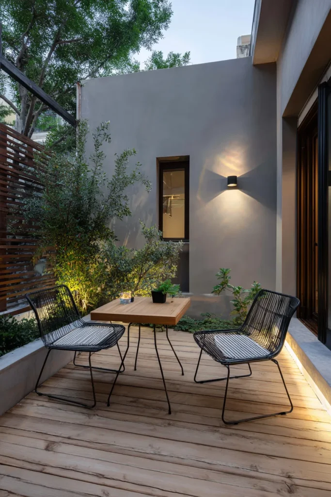 This deck keeps things simple with a tiny table and two chairs positioned along the wall. Wall lighting adds a soft glow while leaving the floor completely open. The wood decking and clean lines make the space feel longer and more open.