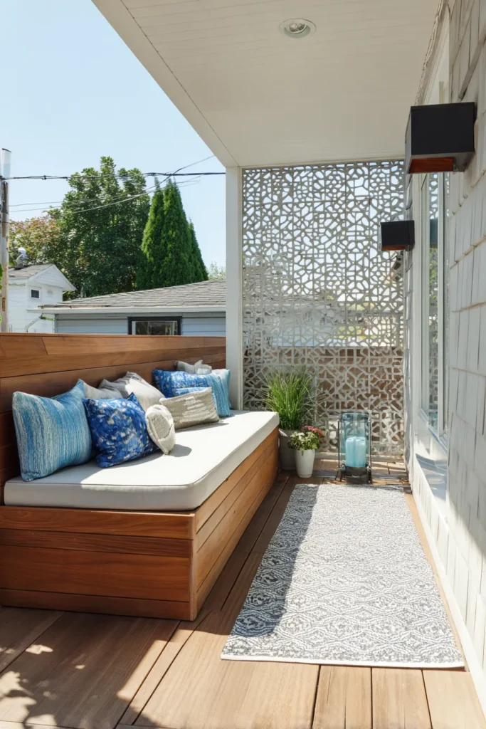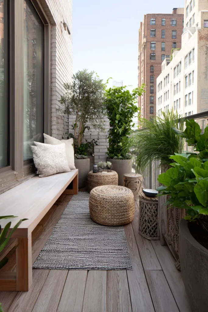 This small city deck uses a single bench with layered pillows and a woven rug to create warmth. Plants are tucked along the railing to add privacy without crowding the floor. The neutral color palette keeps everything light and open.
