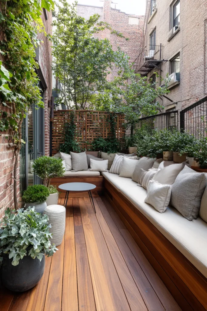 This deck makes smart use of a corner layout with an L shaped bench that fits perfectly into the space. Soft cushions and simple decor keep the look clean, while potted plants add just enough greenery to warm things up. The narrow flooring helps elongate the space visually.