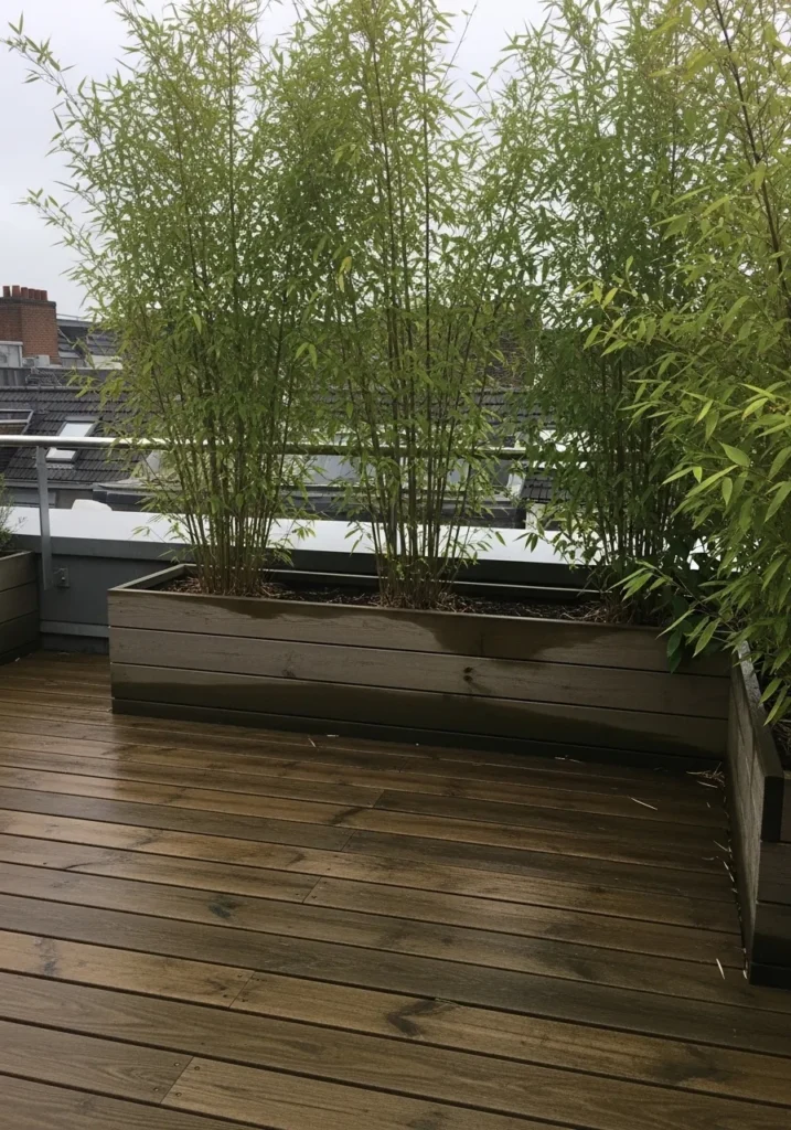 This design shows a rooftop terrace lined with tall bamboo planted in long rectangular planters along the railing. The bamboo rises high and full, creating a natural green wall that feels airy yet private. The deck beneath is warm toned wood with visible grain, and the overall look is clean and modern but still relaxed. The greenery dominates the space without feeling crowded, and the height of the plants makes the terrace feel like a hidden retreat above the city.