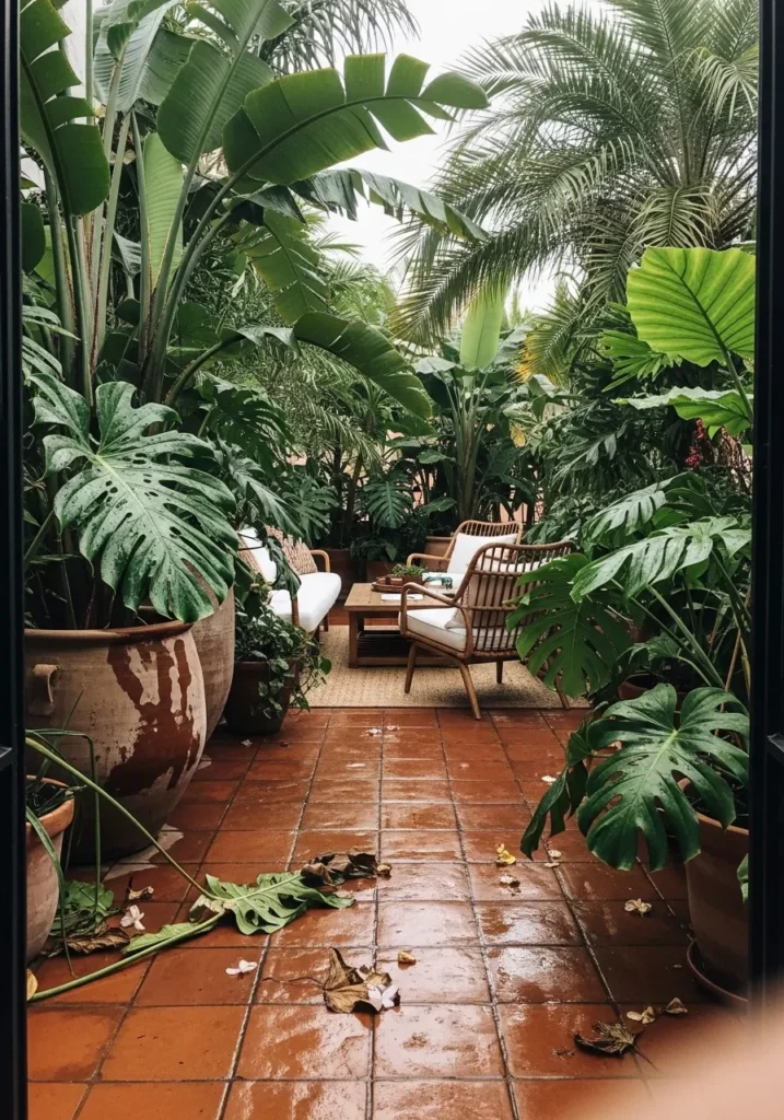 This terrace is packed with oversized tropical plants like monstera and palms, creating a leafy pathway effect. Large pots sit along the edges of a terracotta tiled floor, guiding the eye toward a cozy seating area in the distance. The foliage overlaps generously, making the whole space feel abundant and alive.