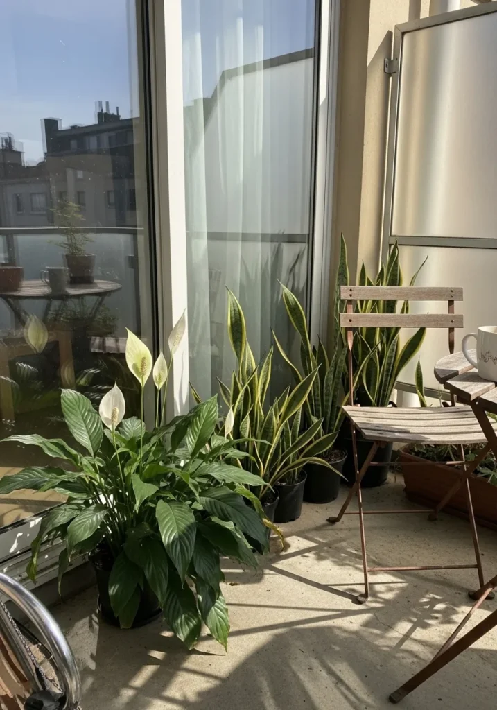 A small terrace corner near glass doors is filled with peace lilies and upright snake plants. The sunlight streams in and highlights the glossy leaves, while the simple furniture nearby keeps the focus on the greenery. The plants are grouped closely, creating density in a compact area.