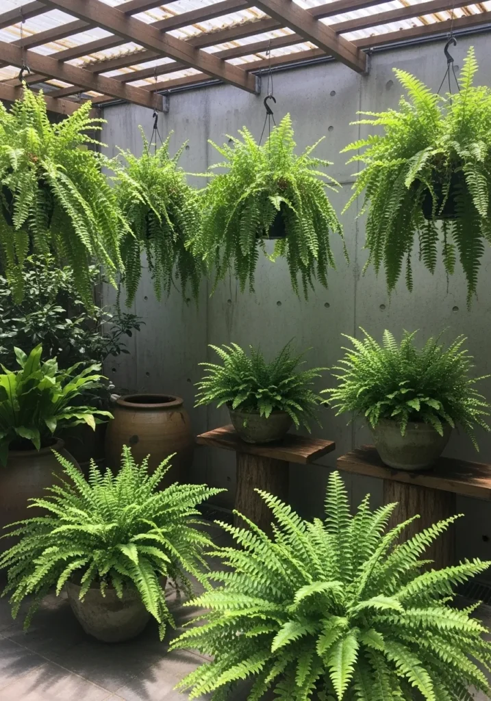 This terrace corner is filled with voluminous ferns placed along a wall beneath a slatted pergola. The soft feathery fronds cascade outward in all directions, creating a thick green layer at different heights. The neutral wall and subtle shadows from the pergola above give the plants even more dimension, making the greenery look extra dense and inviting.