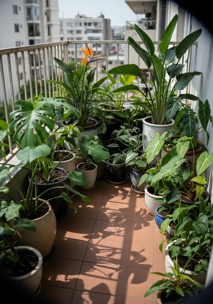 This narrow balcony is filled edge to edge with layered tropical plants in various pots. You can spot glossy leaves, upright stems, and even a bird of paradise peeking through the mix. The terracotta tiles and metal railing frame the plants, while sunlight casts dramatic shadows across the floor.