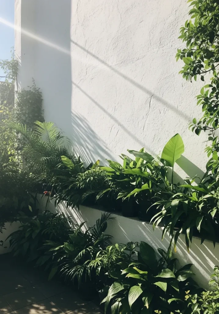 This terrace corner sits against a pale wall with plants arranged along the base, enjoying soft filtered light. Broad leafy plants stretch outward while smaller foliage fills in the gaps, creating a gentle layered look. The light hits the leaves just enough to highlight their texture without overpowering the space.