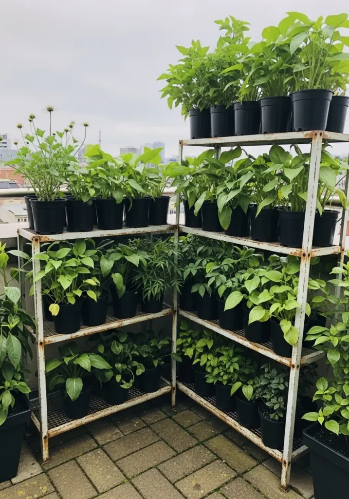 Metal shelving units line this balcony wall, stacked with rows of small potted plants. Each shelf holds dense clusters of greenery, creating a vertical garden effect that maximizes the limited floor space. The uniform pots keep it tidy, while the overflowing leaves bring softness and life to the structured setup.