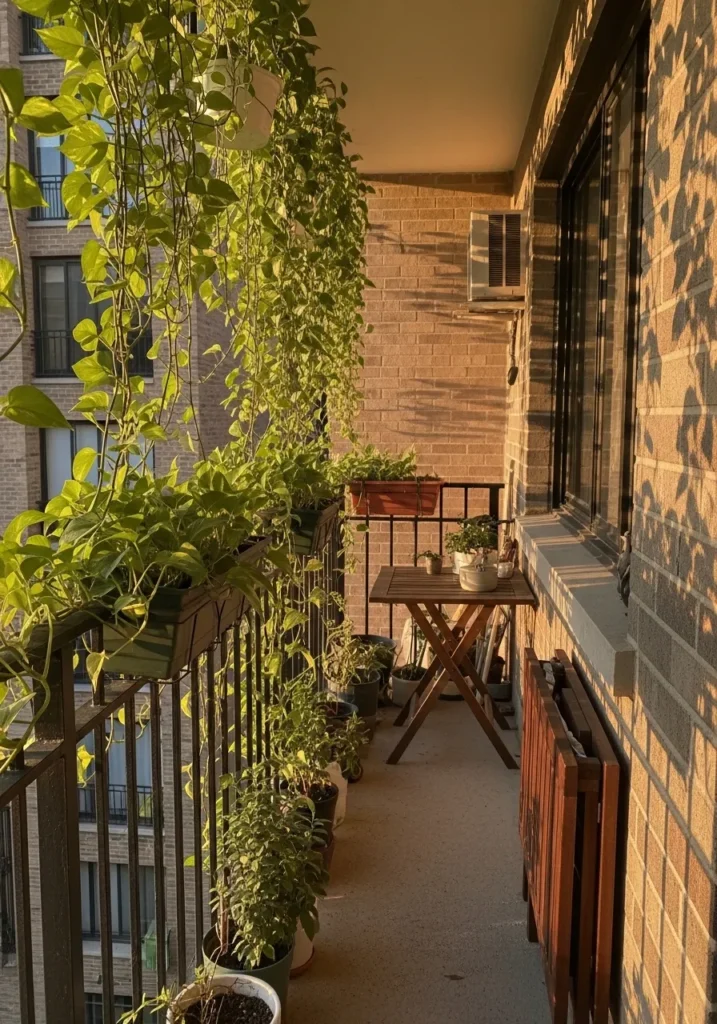 This narrow balcony is wrapped in trailing vines that spill over the railing and hang down from above. The plants soften the hard lines of the brick wall and metal railing, and the golden sunlight makes the leaves glow in the most dreamy way. A slim walkway runs through the middle, with greenery layered at different heights so the space feels full without being cluttered.
