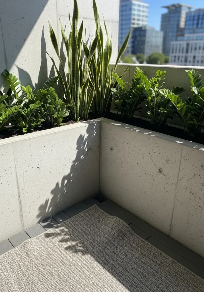 This terrace features crisp white walls and clean lines, with structured green plants tucked neatly into the corner. Tall snake plants and compact leafy varieties sit in simple containers, giving the space a polished and contemporary feel. The contrast between the sharp architecture and the organic leaves is subtle but striking.