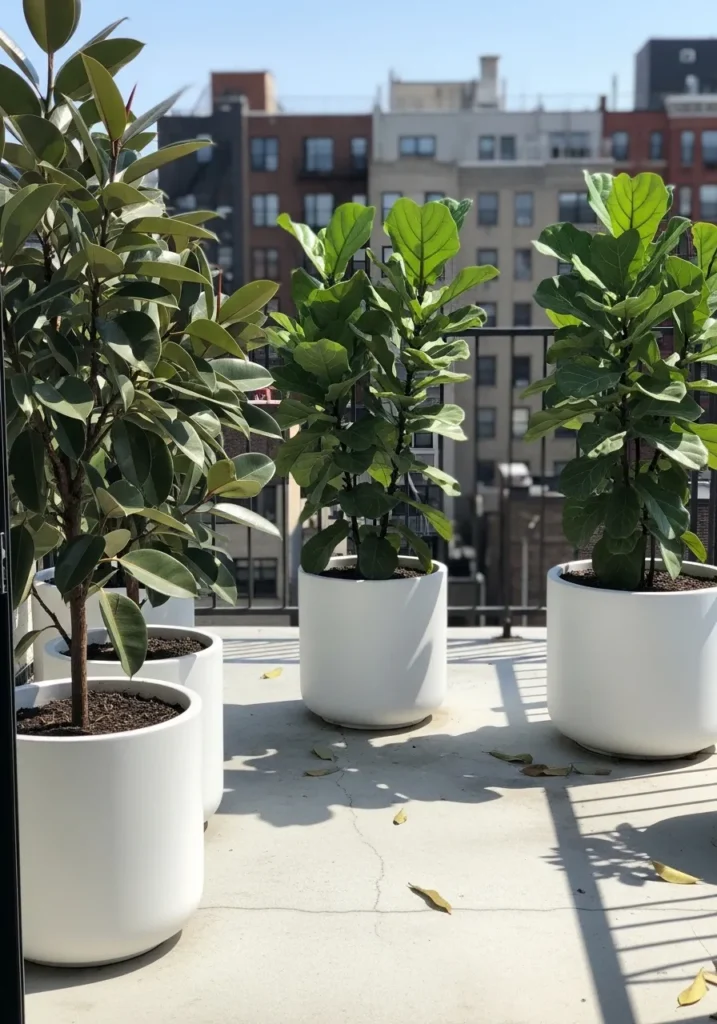 Two large fiddle leaf figs in smooth white pots frame the terrace beautifully. Their broad, glossy leaves stand tall and proud against the city backdrop, instantly commanding attention. The clean planters and simple floor keep the focus on the dramatic foliage.
