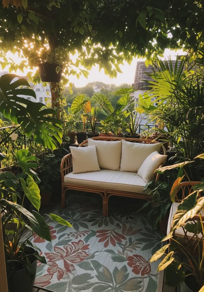 This terrace scene is wrapped in lush tropical plants surrounding a small cushioned bench. Large leaves overlap and filter the sunlight, creating a soft, dappled glow across the patterned floor. The greenery feels layered and immersive, almost like stepping into a mini jungle right outside the door.