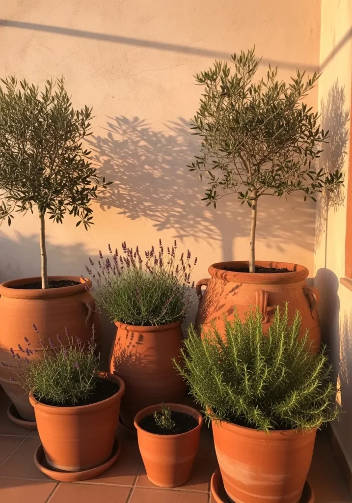 Terracotta pots filled with small olive trees and compact herbs line a warm toned wall. The golden light casts soft shadows behind the delicate branches, and the earthy pots tie everything together. The plants are simple but elegant, giving the terrace a timeless Mediterranean vibe.