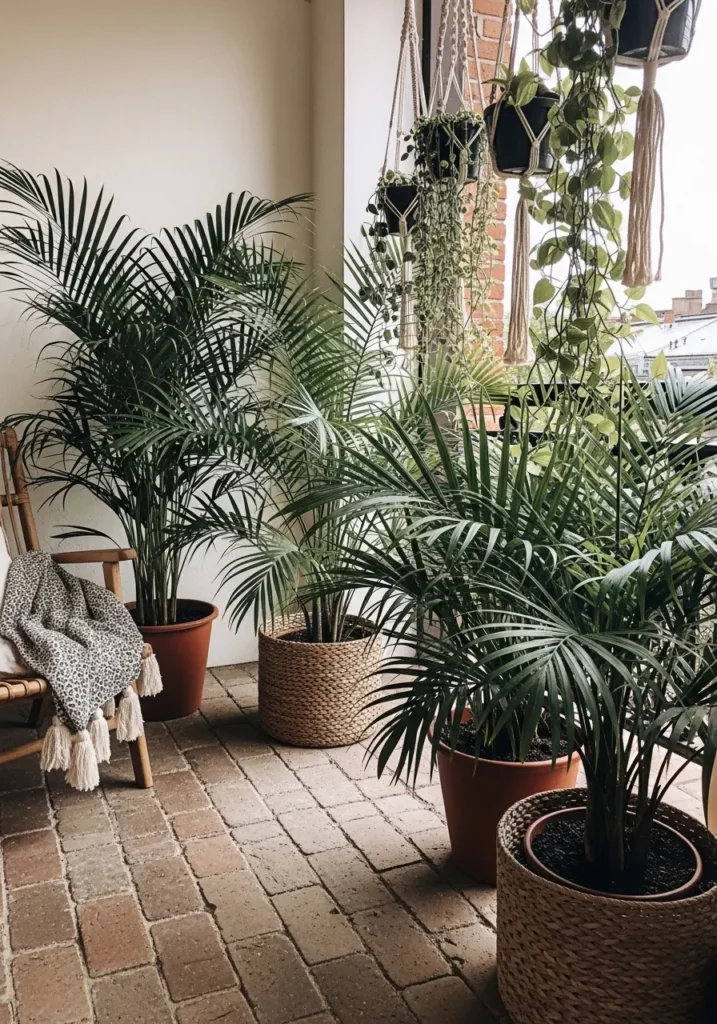 This terrace corner blends interior comfort with outdoor greenery, featuring lush palms in woven baskets placed on brick flooring. The plants are full and feathery, reaching upward and outward, softening the structured space. The mix of textures from brick, basket, and leaves makes the scene feel cozy and layered.