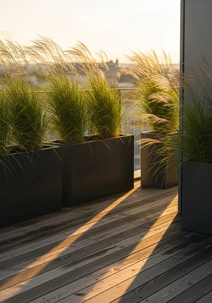 Long black planters filled with soft ornamental grasses line a sleek terrace deck. The grasses sway gently and catch the light, creating movement and texture without overwhelming the space. The contrast between the dark planters and the pale wood flooring adds a contemporary edge.